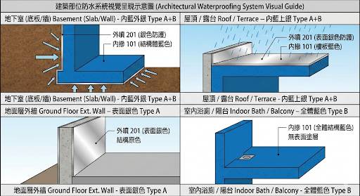 以示意圖呈現建築不同部位的防水系統配置: