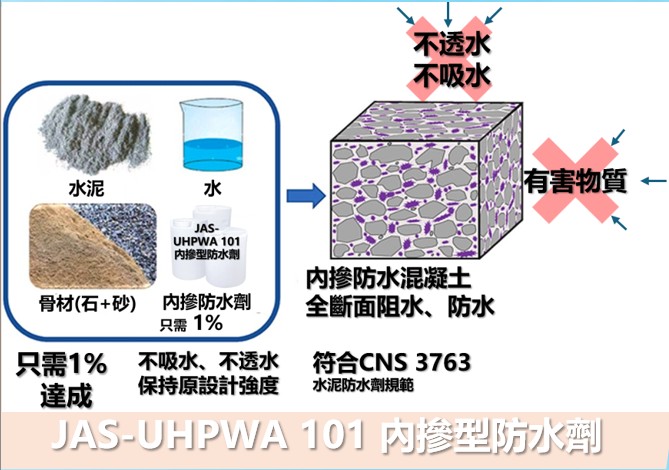 本產品係一種單組份內摻型混凝土用防水劑,採用最先進複合有無機矽的共價鍵結油技術,該技術生產之防水劑可相容於混凝土中,用量僅需粉體重量約1%即可生產全斷面防水之混凝土。JAS-UHPWA 101內摻型防水劑可保護鋼筋混凝土結構物,避免鋼筋腐蝕及混凝土因水侵蝕產生的劣化,可有效提高鋼筋混凝土結構物的耐久性使用壽命;對於有防水需求的各類建築板材類的生產,可輕易降低吸水率達到A級品要求,對於節能減碳起到最直接效益。