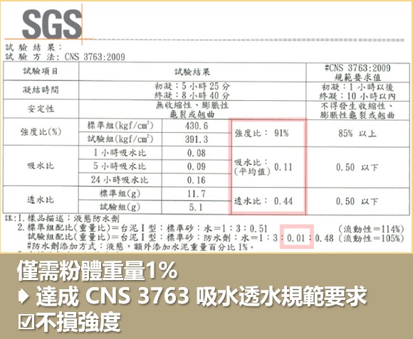 強 度 比:摻和有防水劑者與未摻和者之試體抗壓強度比要0.85以上(CNS 3763:2009)。