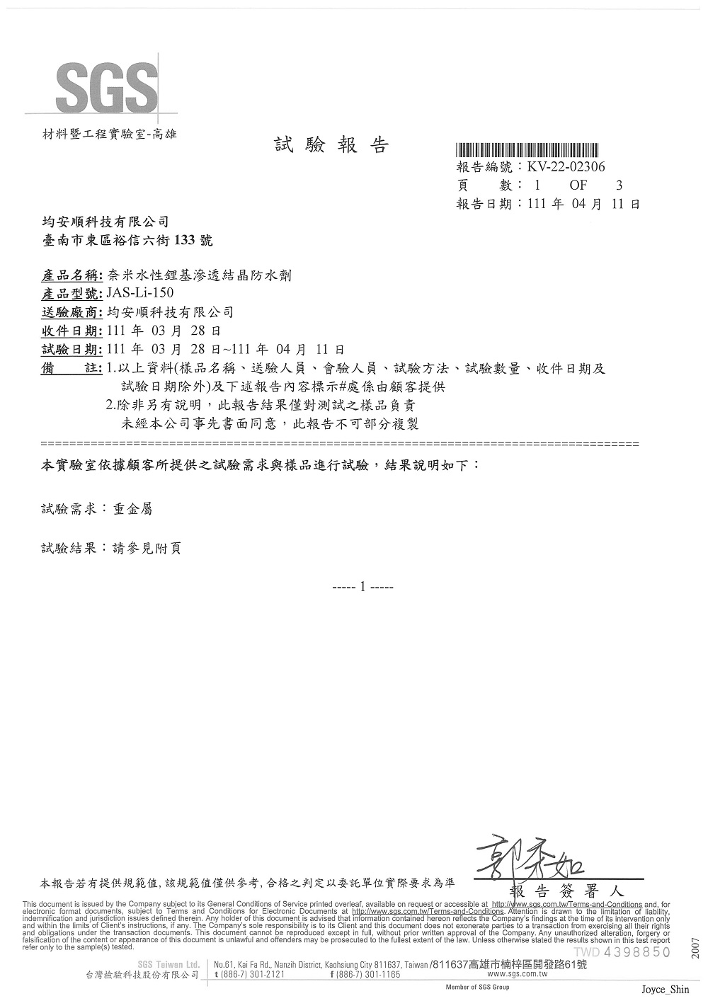 JAS-Li-150 為水溶性高滲透防水材,能快速與混凝土反應產生 C-S-H 礦化結晶,以填補混凝土內部毛細孔隙;並使用奈米液體技術,可於混凝土表面產生強效撥水荷葉效應,有效阻止濕氣或水分滲入混凝土結構物內部。