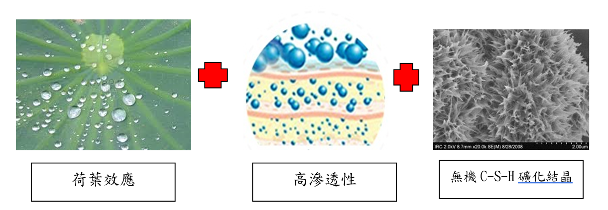 水溶性高滲透鉀基防水材料,能於混凝土內部生成 C-S-H 礦化結晶,深層填補孔隙並產生強效撥水荷葉效應,具備長效防水與耐久保護性能。