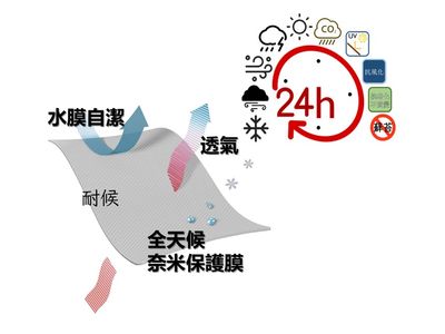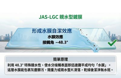 利用 48.3° 特殊親水特性,使雨水接觸表面時不聚集成容易吸附灰塵的水珠,而是迅速攤平成均勻「薄水膜」。