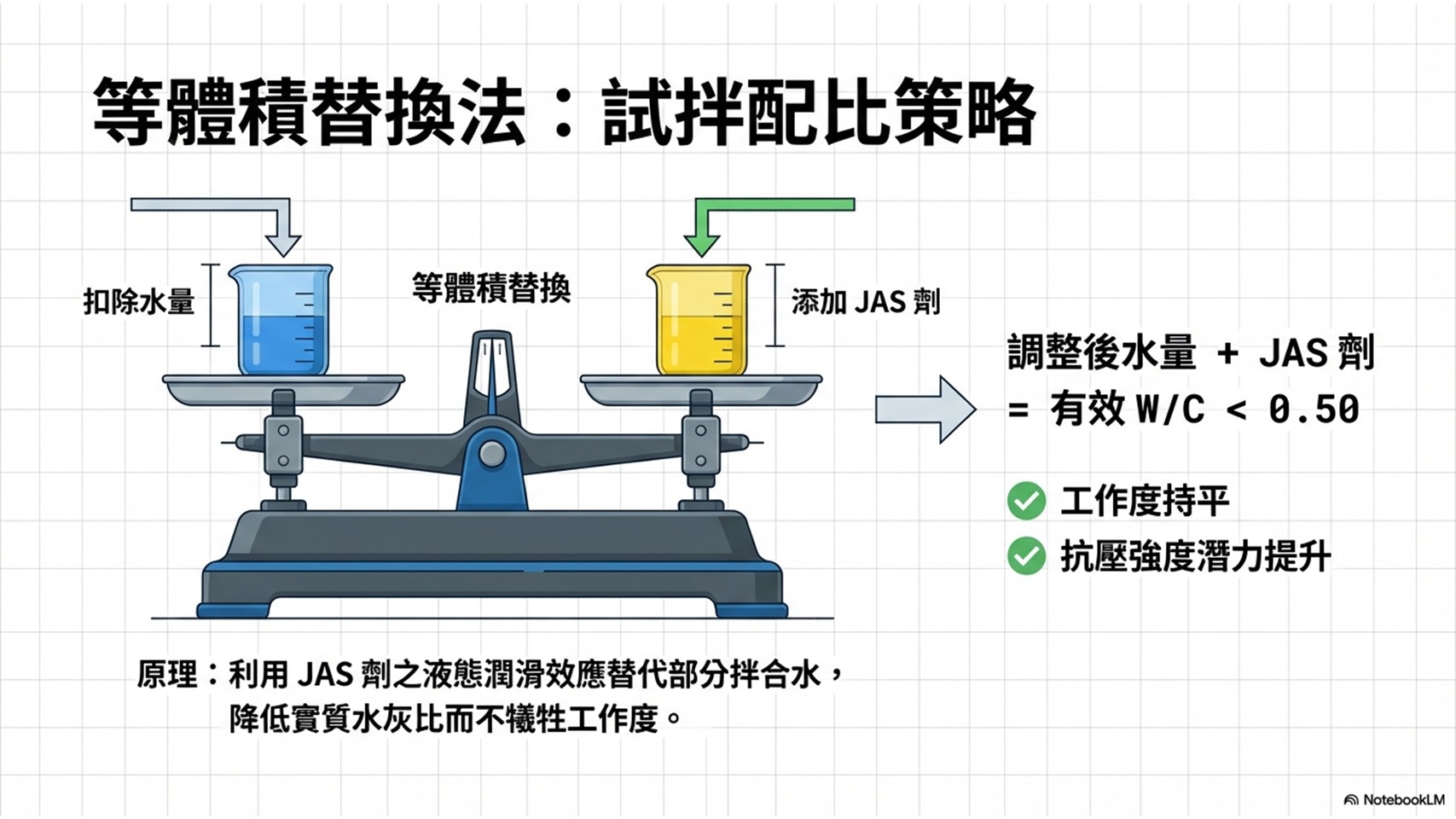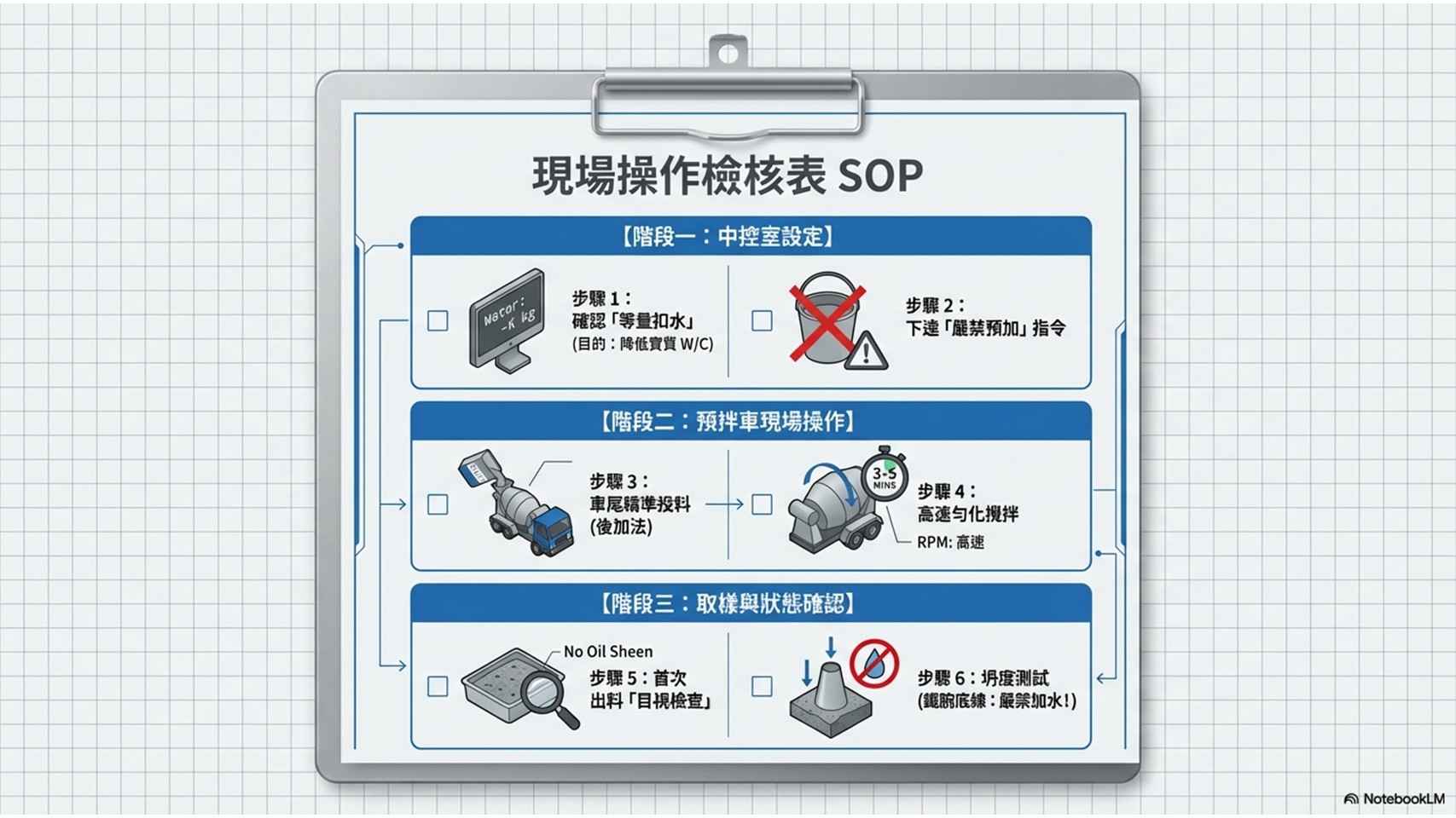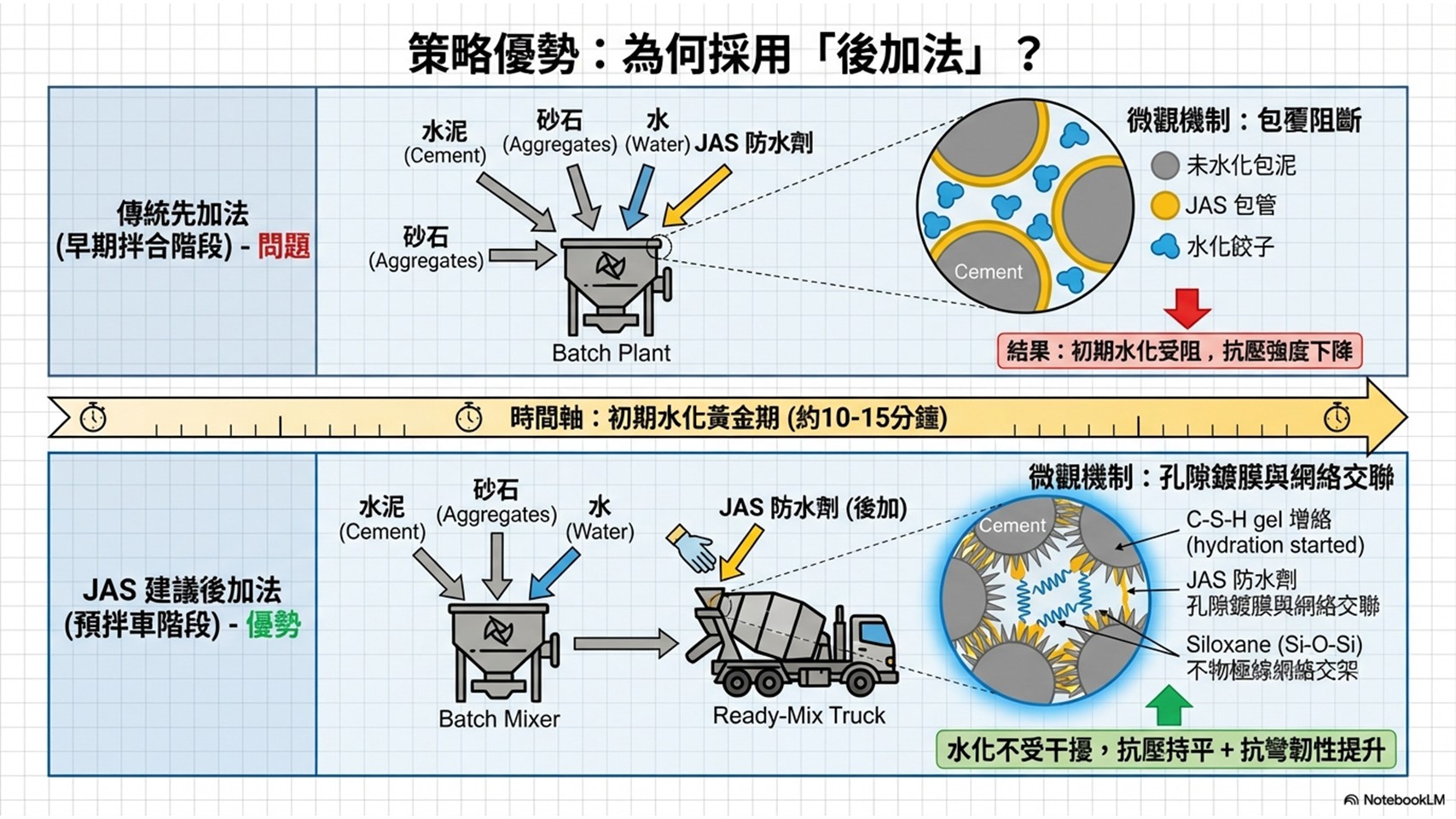 JAS-UHPWA 101 建議採用後加法導入,即在混凝土完成基本拌合後,再將材料加入預拌車中進行高速均化攪拌。此方式可避免影響水泥初期水化反應,使材料在漿體中均勻分散並充分發揮改質效果。透過後加法施工,不僅可維持原有配比設計與工作度,也有助於提升品質穩定性與現場施工可控性。